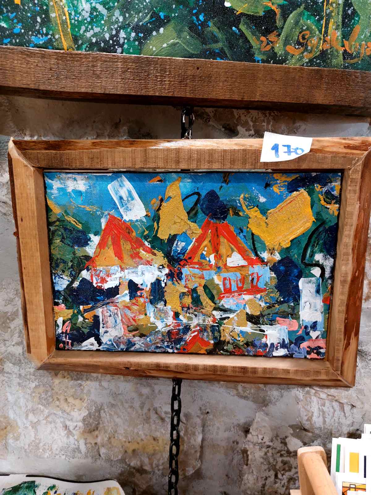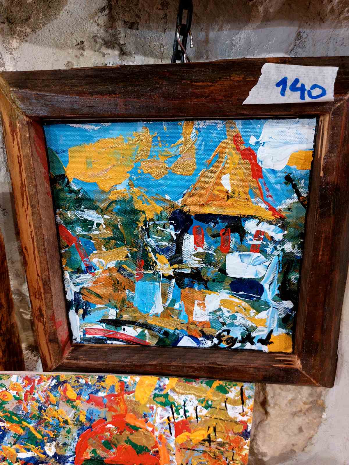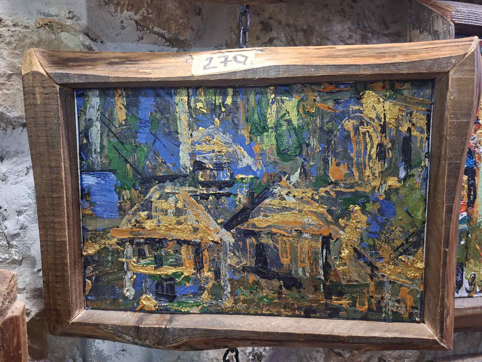U ovom radu istražujem intimni pejzaž bosanske mahale kroz gustu materiju i snažne zlatne akcente. Kuće gradim iz fragmentiranih poteza koji se stapaju sa drvećem i nebom, stvarajući dojam da arhitektura i priroda dišu kao jedno. Zlato koristim kao simbol topline, sjećanja i duhovne svjetlosti, dok tamne strukture daju ritam i nose konstrukciju slike. Ovim slojevitim pristupom želim prikazati staru bosansku kuću kao mjesto trajanja, tišine i skrivenog života koji treperi ispod površine boje.