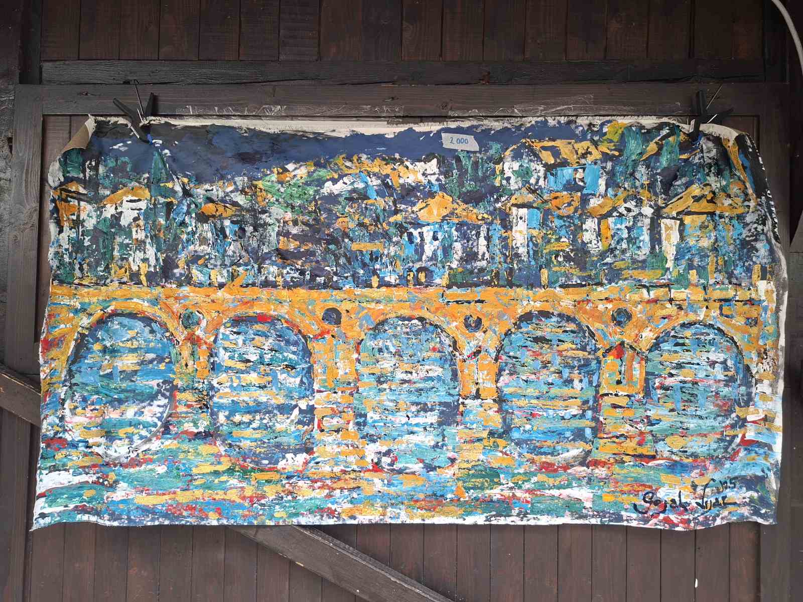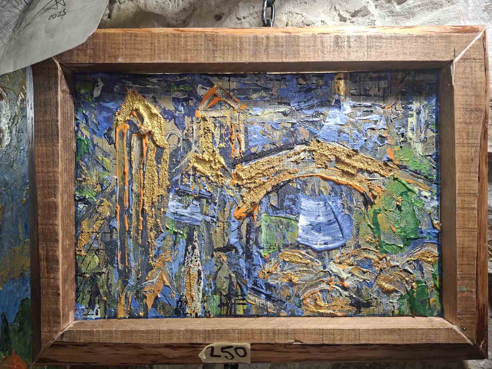 Na ovoj slici naslikao sam most kao simbol spajanja ljudi, kultura i civilizacija. Njegovih pet lukova izgradio sam potezima špahtle, kao da ih drže ljudi zagrljeni i povezani rukama, čineći od mosta živi lanac zajedništva. Rijeka ispod titra u slojevima boje, puna energije, svjetlosti i pokreta, kao da diše u ritmu zemlje. Bosanski pejzaž uz obalu, sa mahalama i krovovima, izranja iz pastoznih nanosa boje, između sna i stvarnosti. U svakom potezu osjećam dah Bosne – topli, iskreni, slikarski san o povezanosti i životu koji ne prestaje teći. U svakom potezu osjećam dah Bosne – topli, iskreni, slikarski san o povezanosti i životu koji ne prestaje teći.